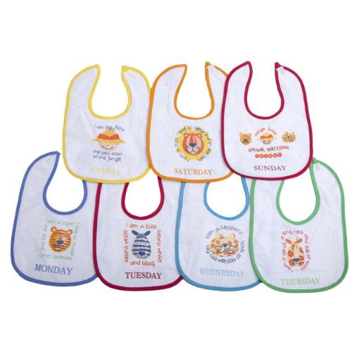 Bavoirs à motifs animaux pour bébé garçon et fille, un pour chaque jour de la semaine (options pour garçon et fille). Bavoirs de qualité suupérieure pour bébés. Composition: 65% coton et 35% polyester. Sangle velcro pour l'accrochement du bavoir. Verso en plastique. Lavable à la machine. Idéaux pour le repas....