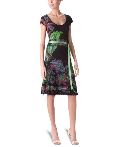 Desigual Ojala - Robe - Femme. - Robe mi longue blanche - Imprimés multicolores - Coupe trapèze - Dentelles sur le bas - Petit lien satiné vert - 100% viscose......