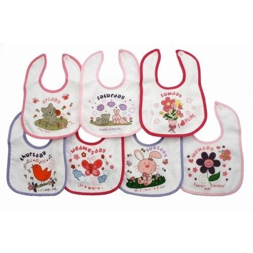 Ensemble de 7 bavoirs pour bébé fille, un pour chaque jour de la semaine, à motif animaux et avec sangle velcro (lot de 7). Bavoirs résistants de bonne qualité pour nouveau-nés (bavoirs de petite taille), avec verso imperméable qui empêche les aliments de pénétrer à travers. Idéaux pour les nouveau-nés. Absorbants, avec sangle adhésif velcro qui s'attache en toute sécurité sans enchevêtrement. Composition: 65% coton et 35% polyester. Utilisables dès la naissance. Lavables à la machine....