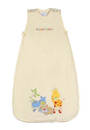 - Une gigoteuse dans les tons crèmes. Les parents comme les enfants adorent notre girafe, tigre et zèbre. Les mots « Jungle Friends » sont inscrits au niveau de la poitrine.